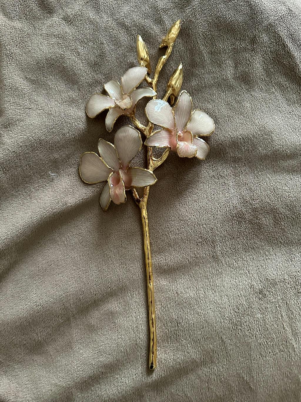 Just like our famous Gold Roses, our Golden Orchids begin as real Dendrobium Orchids! This particular orchid is a deep purple in color. It has been chosen and preserved at the height of its beauty and sealed in a durable clear lacquer shell to preserve its color and beauty of nature forever! Next, the stems of the orchid are electroformed and plated in genuine 24K Gold! Truly a breathtaking masterpiece for your life-time enjoyment. If you like our roses, you will love our orchids!