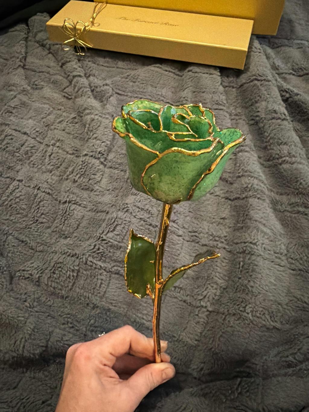 Got the August (Peridot) Forever Rose for Valentine’s Day today and I LOVE IT!!!! My favorite color is green but finding a rose that’s green is almost impossible… until now! Absolutely stunning green sparkles throughout! The 24K gold trim is beautiful!! Entire piece is breathtaking!! Love that this gift is out of the “everyday boutique” that wilts and dies. Personalized engraving on the stem! I Bought the single crystal vase from here to display! Will add photos when it arrives!! Work is top-notch!! Your partner will love, love, love, this unique gift idea!!