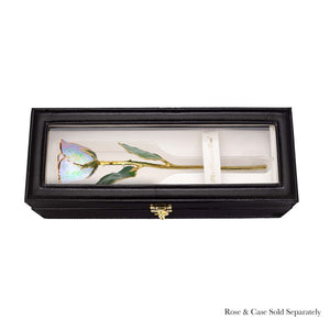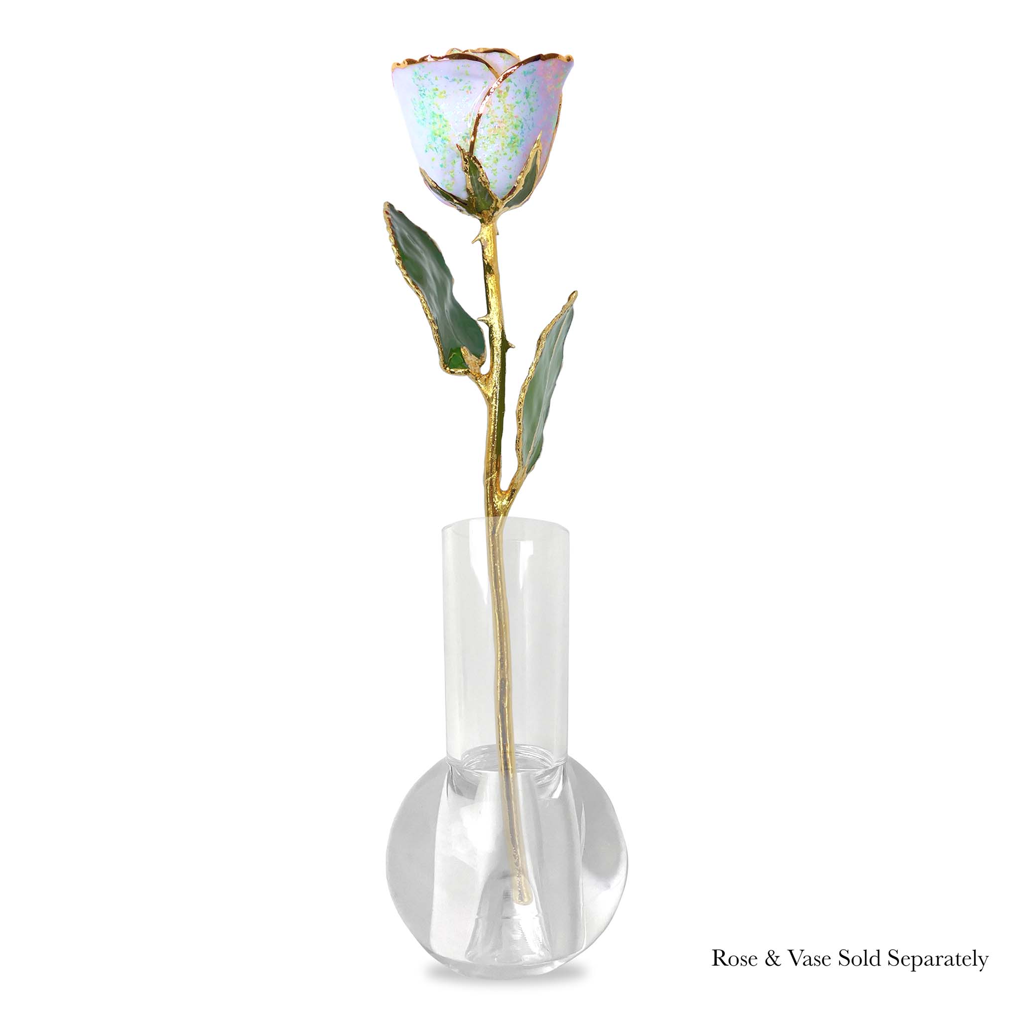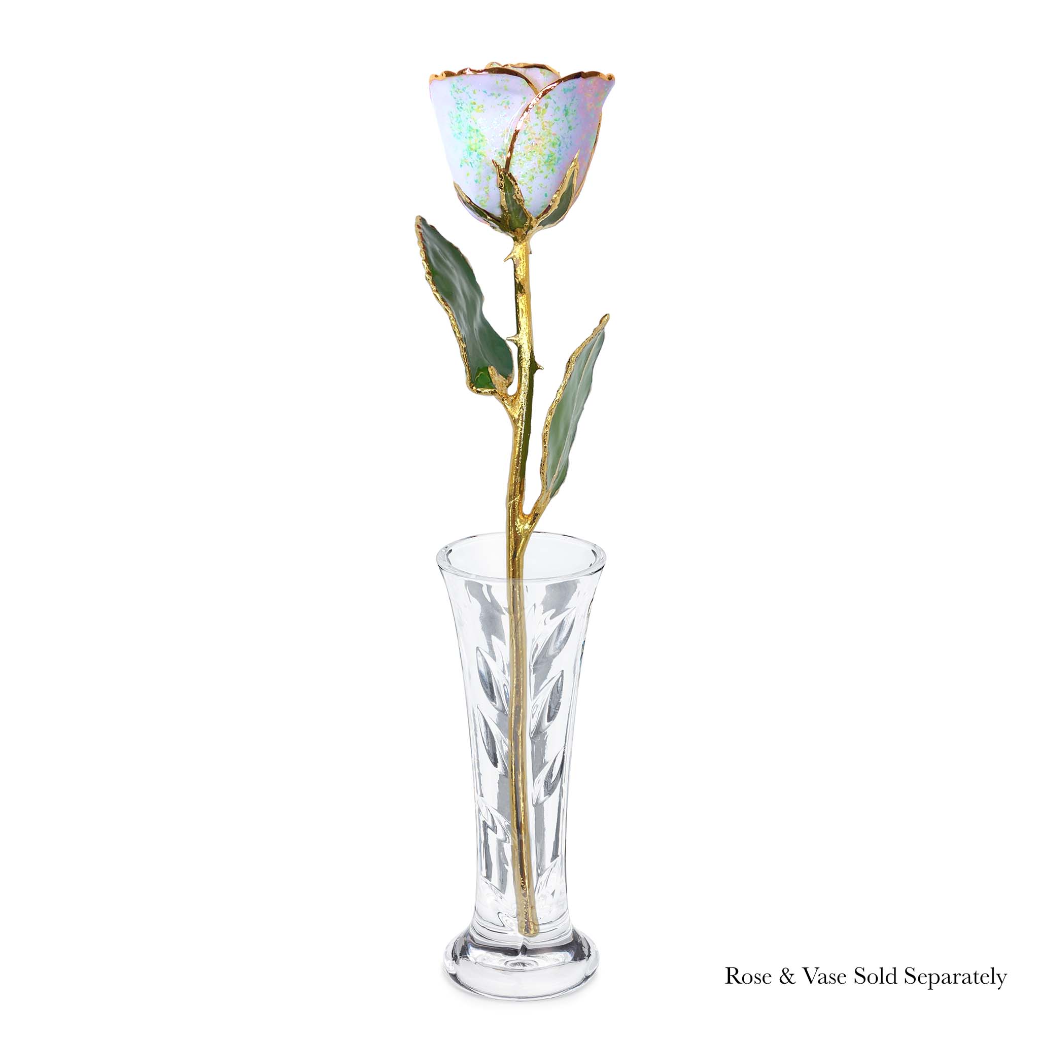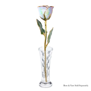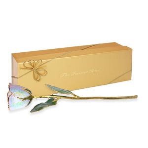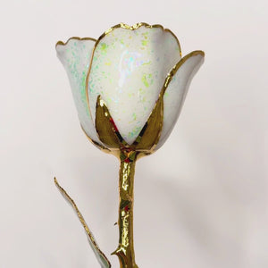 Our Opal Sparkle rose is made from a real rose and is preserved by hand with a highly reflective lacquer finish with suspended multi color sparkles that contrast perfectly with the white petals. We finished off this rose using real 24K gold on the stem, the tips of the leaves, and the tips of the petals.