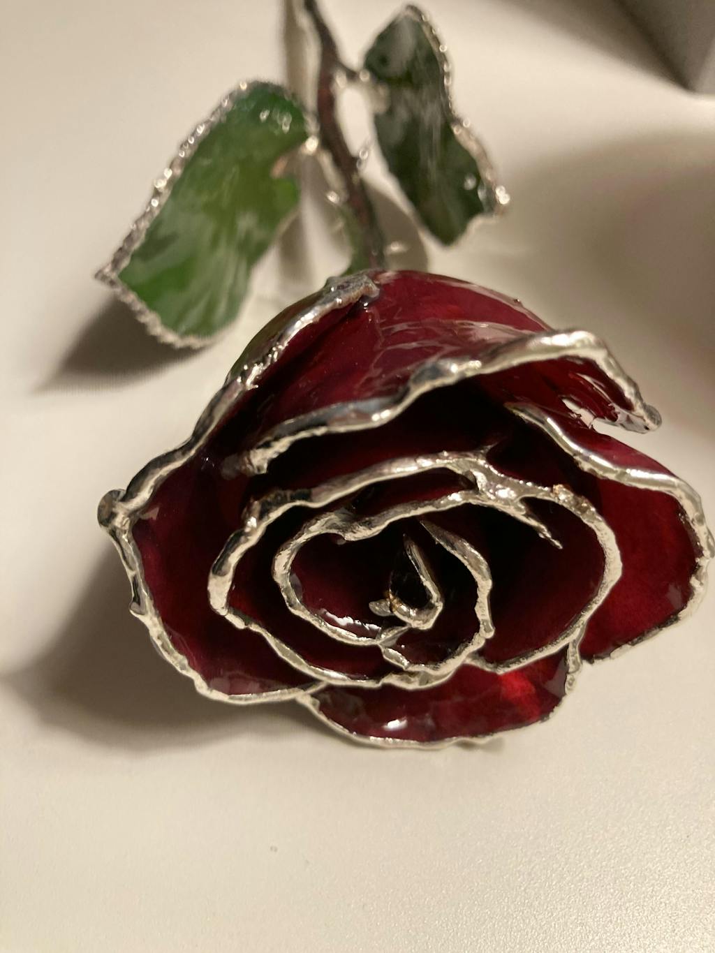 Please note: Just like fine silverware and silver jewelry, our genuine Silver Forever Roses naturally tarnish over time. Some people enjoy this authentic patina, but if you wish to keep your rose shiny, we recommend using a Forever Rose polishing cloth (sold separately).