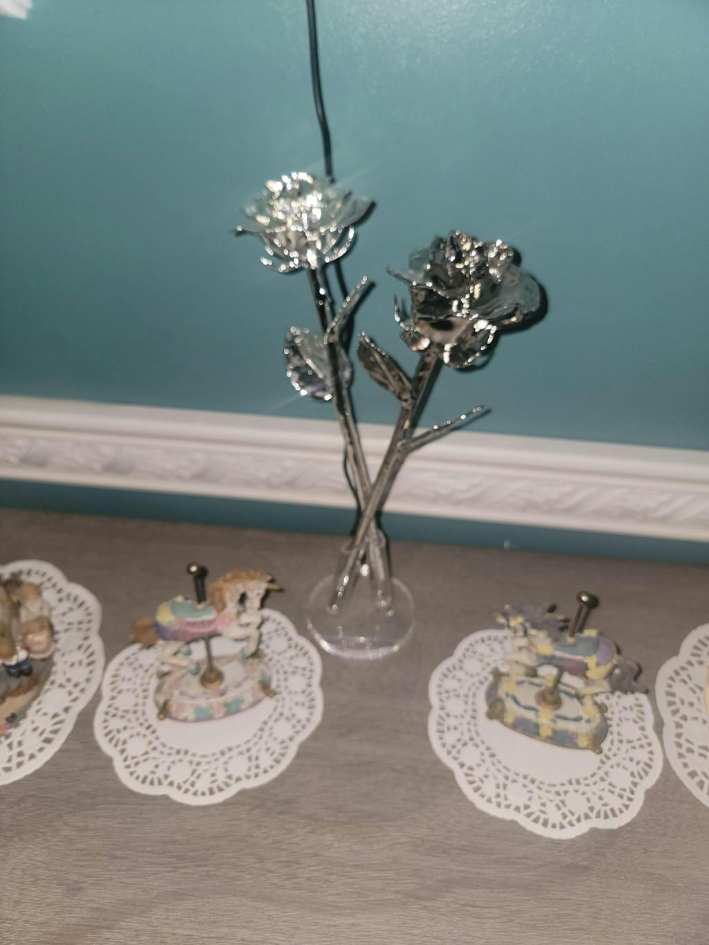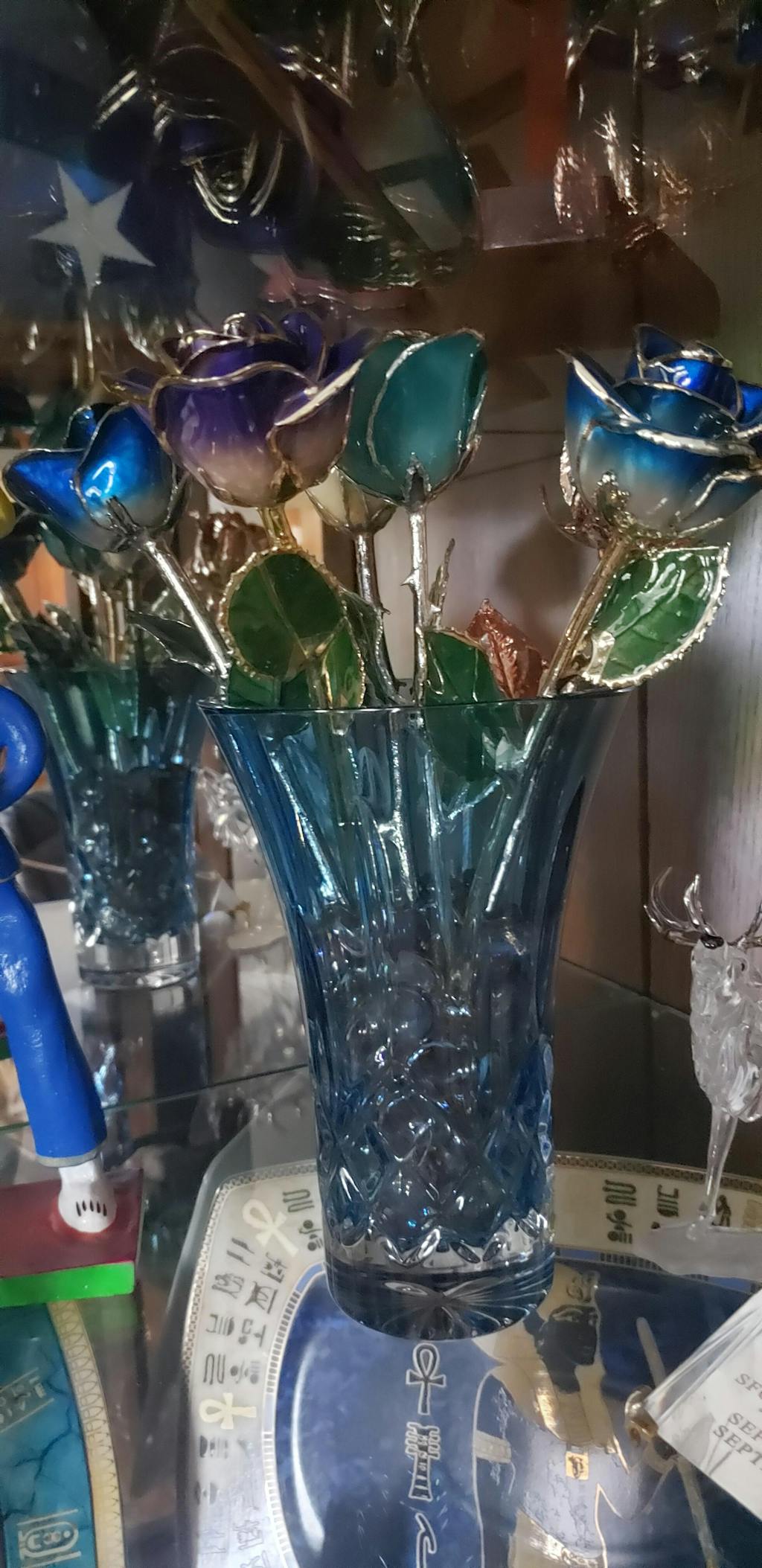 This Rose is timeless and Beautiful, a wedding gift for September it cannot be displayed, however I'll display others we've purchased! Silver and Platinum Roses displayed together in our acrylic stand.