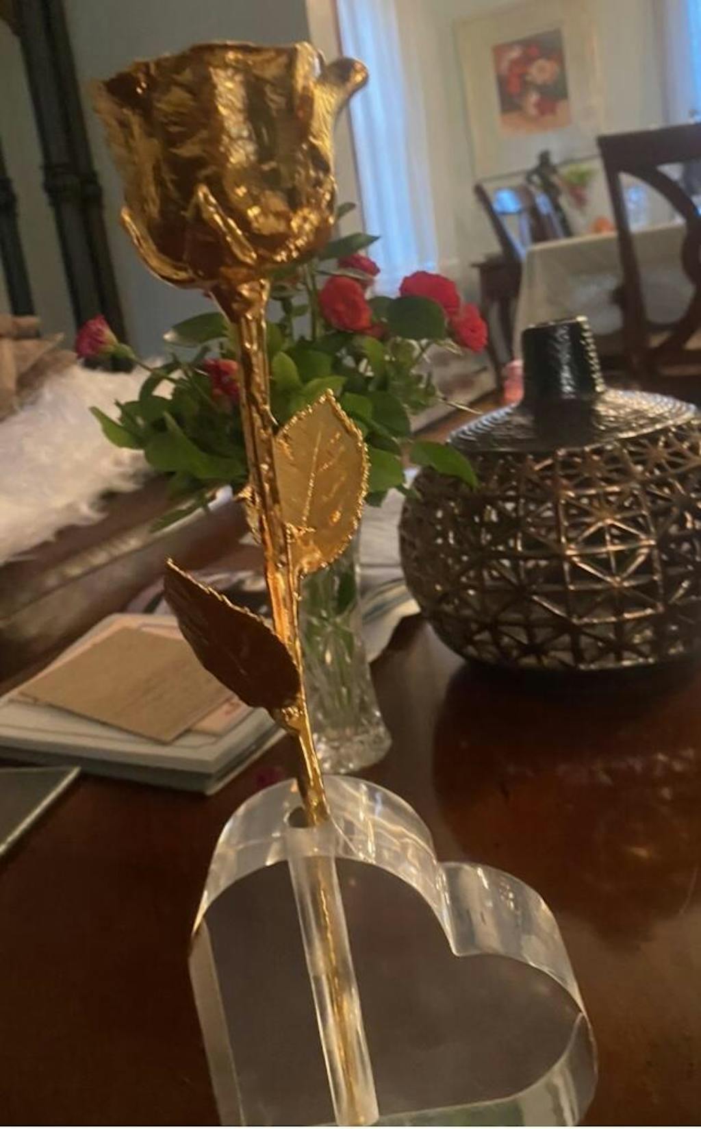 "I just received the "Prefect rose" gold I am so excited that I had to send this asap I do not normally give reviews but this time I felt it warranted one. This is truly the most beautiful thing I have ever seen just as the name implies it is perfect and the bud vase is also a great match to display it in I am sure my wife will cherish it forever. After I give it to her I will write another review that will be a little better composed like I said I am very excited. I must also say the service I experienced was excellent I ordered it on line at approximately 11 pm central time and it shipped the next day and actually arrived one day earlier than expected in perfect shape the packaging was very pretty and secure the only way it could of be damaged was if they ran over it. The only way I can describe my experience with your product and service is perfect."