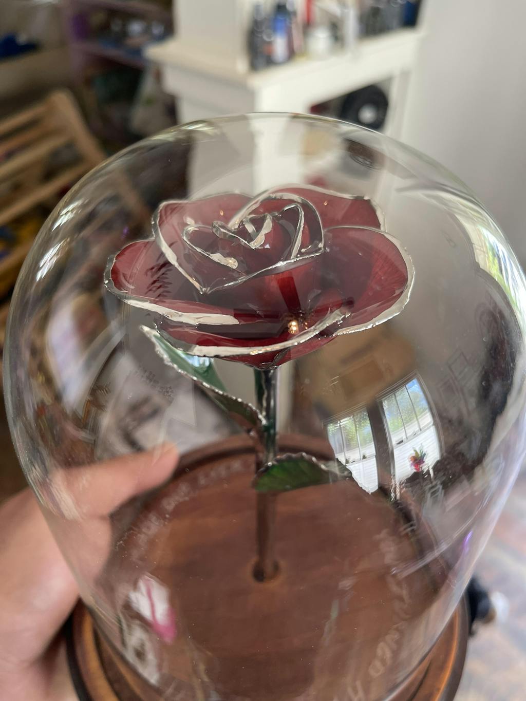 This Custom Enchanted Rose features a genuine Platinum Trimmed Forever Rose permanently mounted to a wood base, complete with a glass dome.