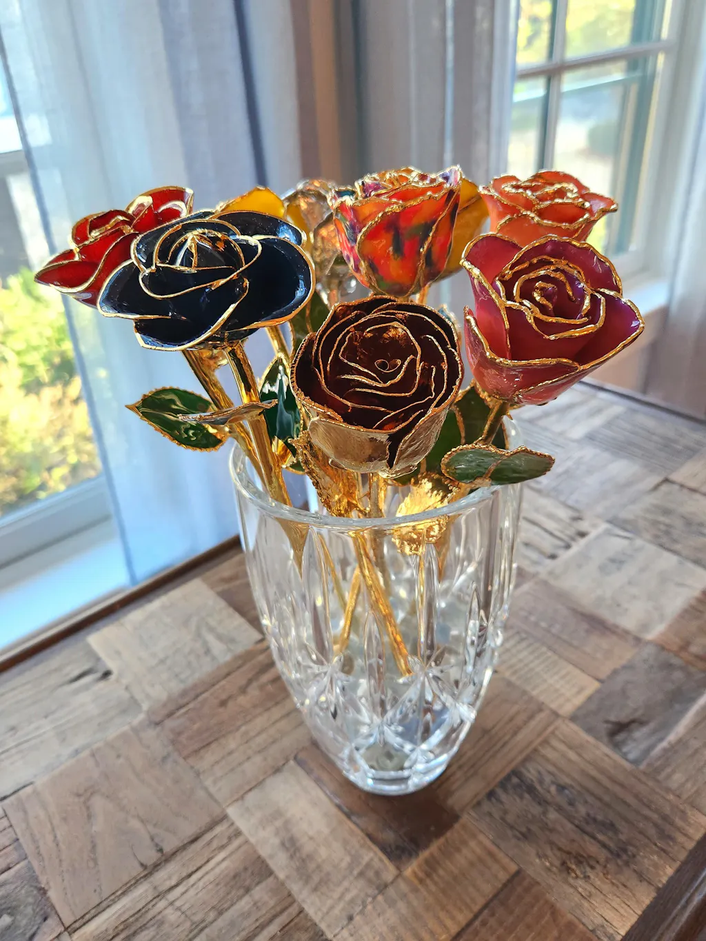 I repurposed a vase I had to create an anniversary gift for my husband's son and daughter-in-law. Although not the exact vase, my vase has the same 9" height with 5.5" opening dimensions. All the roses are Forever Roses: 1 each of Picasso; Royal Blue; Pale Yellow; Orange Spice; Red Open Bloom; Pink Amethyst; White to Yellow; 24k Gold dipped & Platinum dipped roses